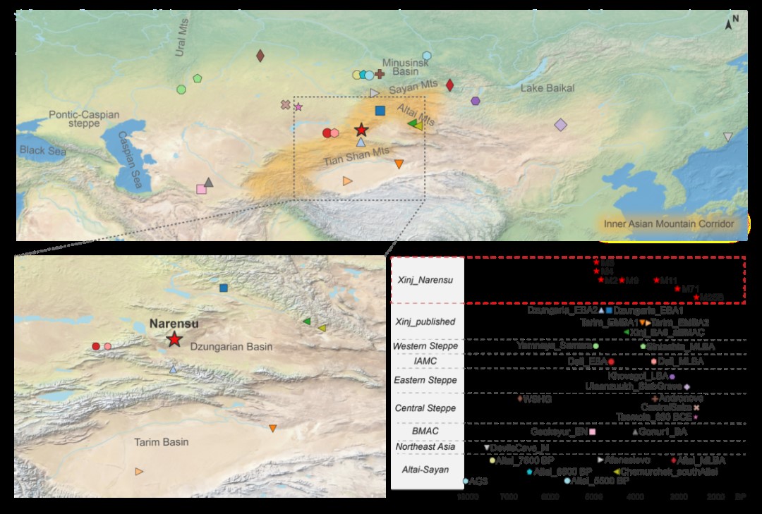 新疆西北部作为欧亚大陆文化与基因交流的重要枢纽,其人群演变历史长期以来因缺乏连续的时间序列数据而模糊不清。针对这一空白,崔银秋教授与王轲研究员团队深度合作,利用古DNA技术成功获取了那仁苏遗址7例古代个体的全基因组数据,系统重建了该地区从铜石并用时代到铁器时代(约5000-2500年前)长达2500年的遗传演化图谱。