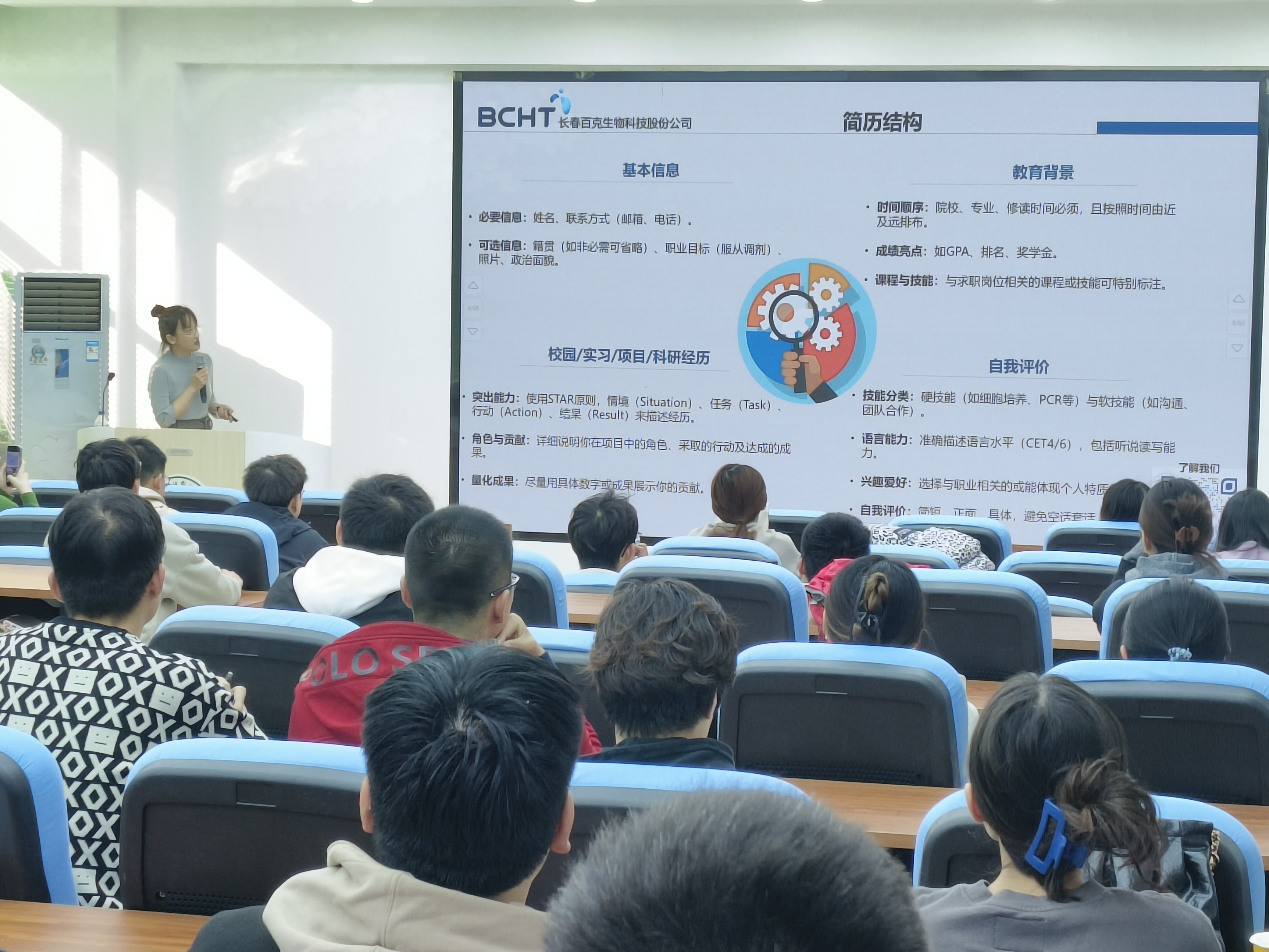 百克生物人力资源部经理杨阳首先介绍了生命科学行业的发展趋势和就业前景。她指出,随着科技的不断进步,生命科学领域正迎来前所未有的发展机遇,对专业人才的需求也日益增长。然而,研究生们要想在这个领域脱颖而出,不仅需要扎实的专业知识,还需要具备良好的沟通能力、团队协作精神和创新思维。