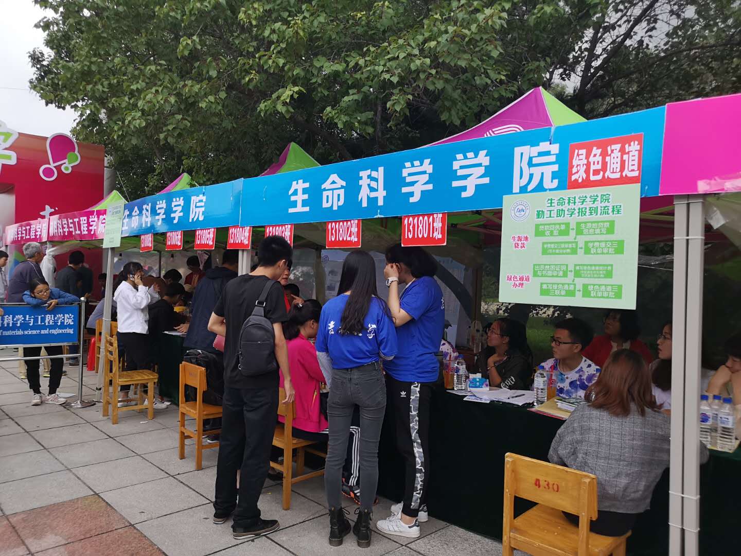2018级本科新生代班代团及迎新志愿者们就已在五月花集合待命,在微微小雨中布置好了迎新场地,党委副书记崔帅、学工办主任张春阳、辅导员马莹、2018级辅导员丁子芮以及团学联的学生干部们在现场等待着2018级新生前来报到。